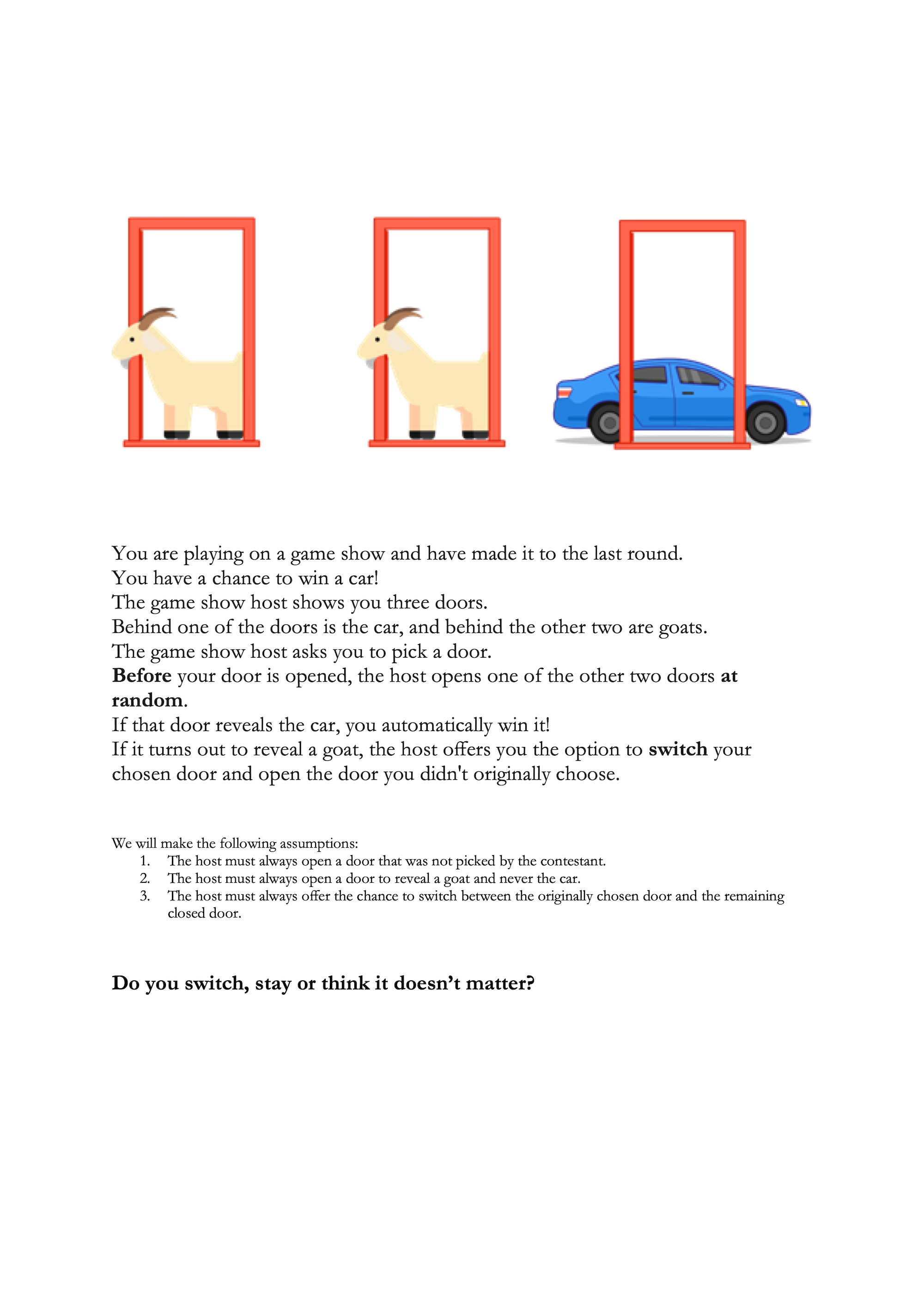 C) It doesn’t matter if you switch or stay.