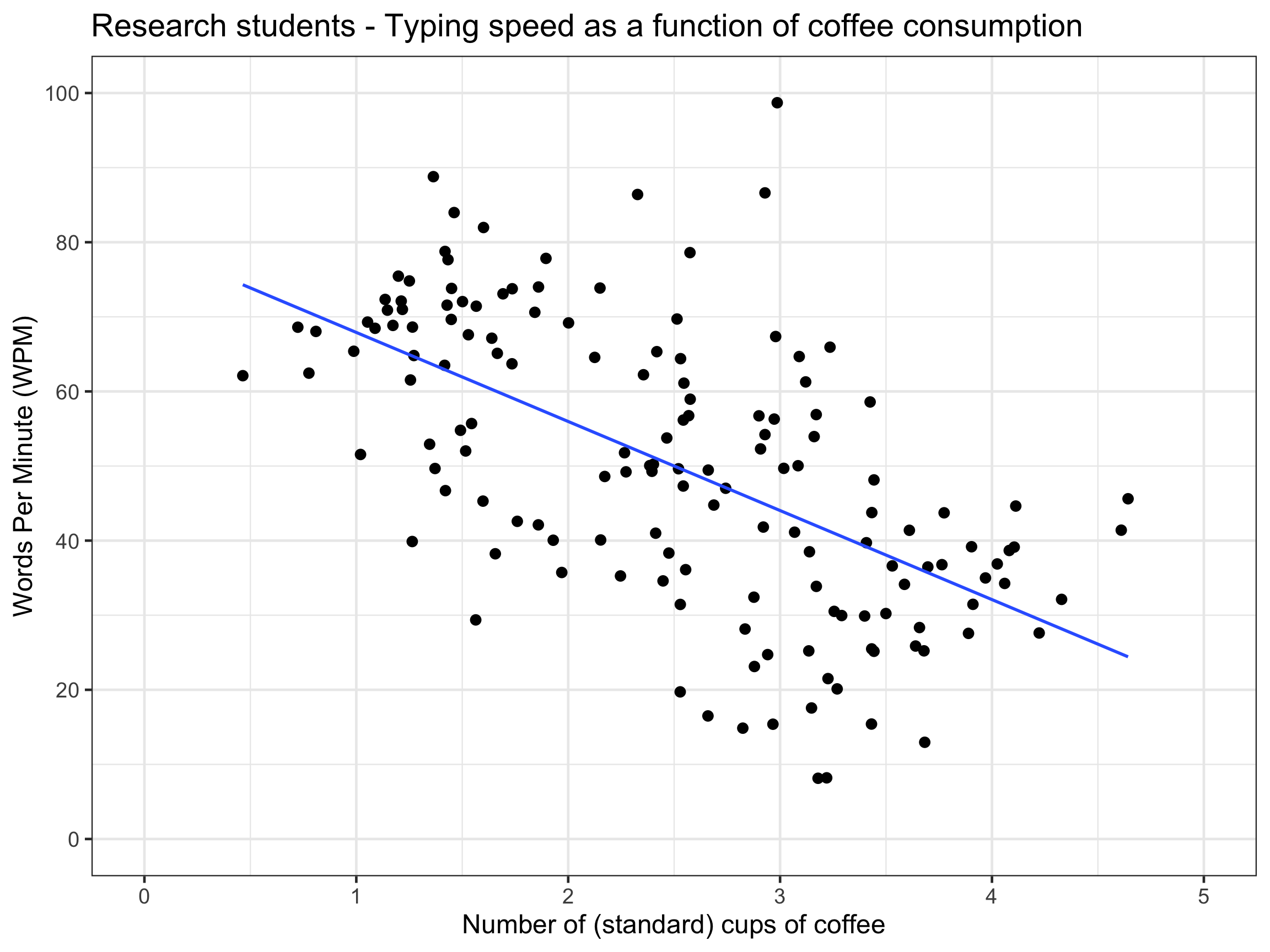 ggplot(dat, aes(x = V1, y = V2, color =`Student Type`)) +geom_point(size =3) +geom_smooth(method ="lm", se = F) +ggtitle("Research students - Typing speed as a function of coffee consumption") +xlab("Number of (standard) cups of coffee") +ylab("Words Per Minute (WPM)") +scale_y_continuous(limits =c(0, 100), breaks =seq(0, 100, by =20)) +scale_x_continuous(limits =c(0, 5), breaks =seq(0, 5, by =1)) +theme_bw(base_size =18) +theme(legend.position =c(1,1), legend.justification =c(1.1,1.1))