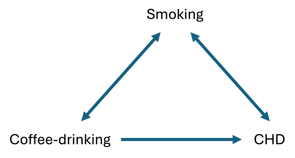 What this DAG helps to summarise is what we are now wondering - is smoking confusing or distorting the association between coffee drinking and the development of CHD? In other words, is smoking a confounder in the association between our exposure (coffee-drinking) and outcome (CHD) variables of interest?