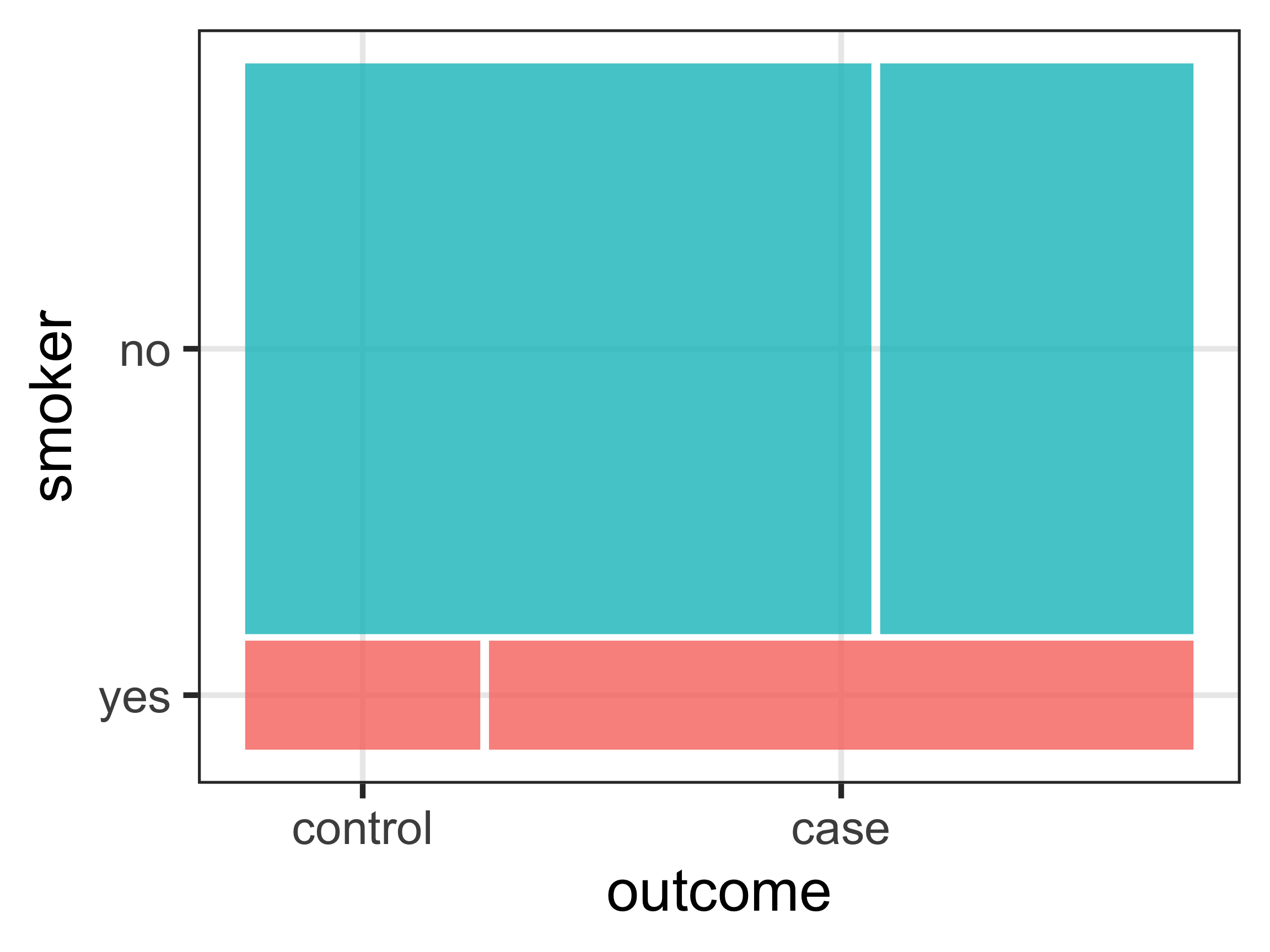 Given the binary nature of all three variables we can explore the relationships nicely using a basic workhorse of epidemiological analysis - the 2x2 contingency table. In its simplest form this shows the frequency cross-tabulation of the exposure with the outcome. However, I think it’s also useful to display the conditional row percentages - in other words, the proportions (probabilities) of each outcome (categories as columns) given a particular exposure (categories as rows). In this way it is easy to eyeball whether the exposure is associated with the outcome without doing any specific test simply by looking at whether the row percentages vary greatly. As a good visual accompaniment for each cross-tabulation, I am also going to generate mosaic plots. These can give you an impression of potential associations without using any actual numbers.