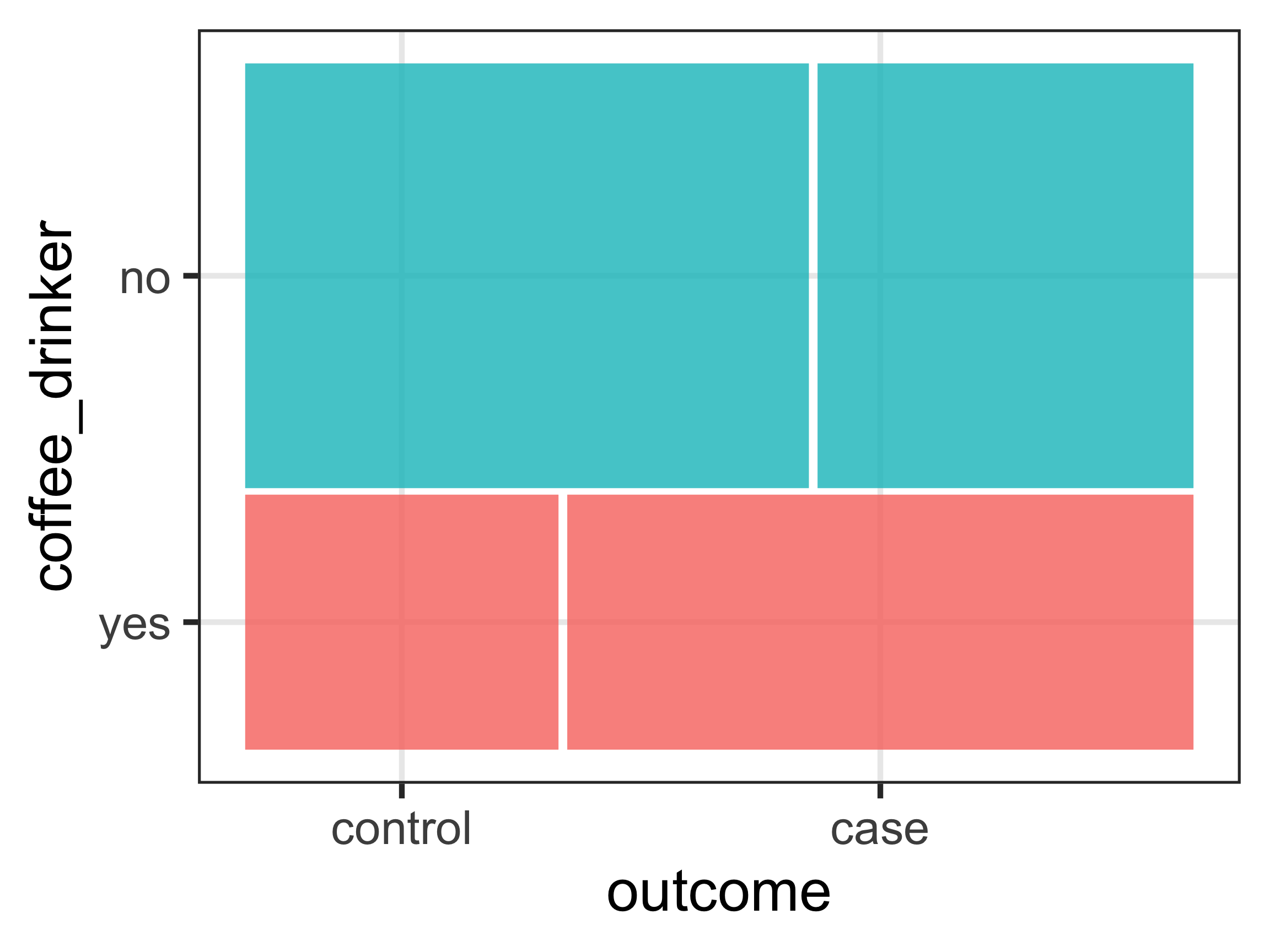 The following cross-tabulation and mosaic plot show the potential association between coffee-drinking and CHD. If we look at the proportions of people with CHD in each exposure group we can see that these do in fact differ - 67% of coffee drinkers develop CHD, compared to 40% of non-coffee drinkers. That is a telling sign of an association before we even do anything. The mosaic plot mirrors these numbers graphically.