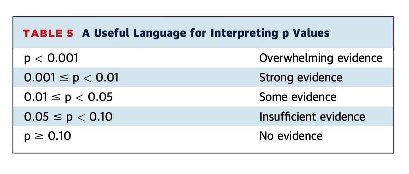 We can still calculate p-values as we currently do - nothing needs to change. But instead of referring to the p-value itself, let’s start discussing our results in the context of ‘evidence’ (i.e. against the null hypothesis of no effect). The following table from this paper sums it up beautifully and so I am not going to reinvent the wheel (in fact I can thoroughly recommend the other 3 papers in the series, so do give them a look if you have time).