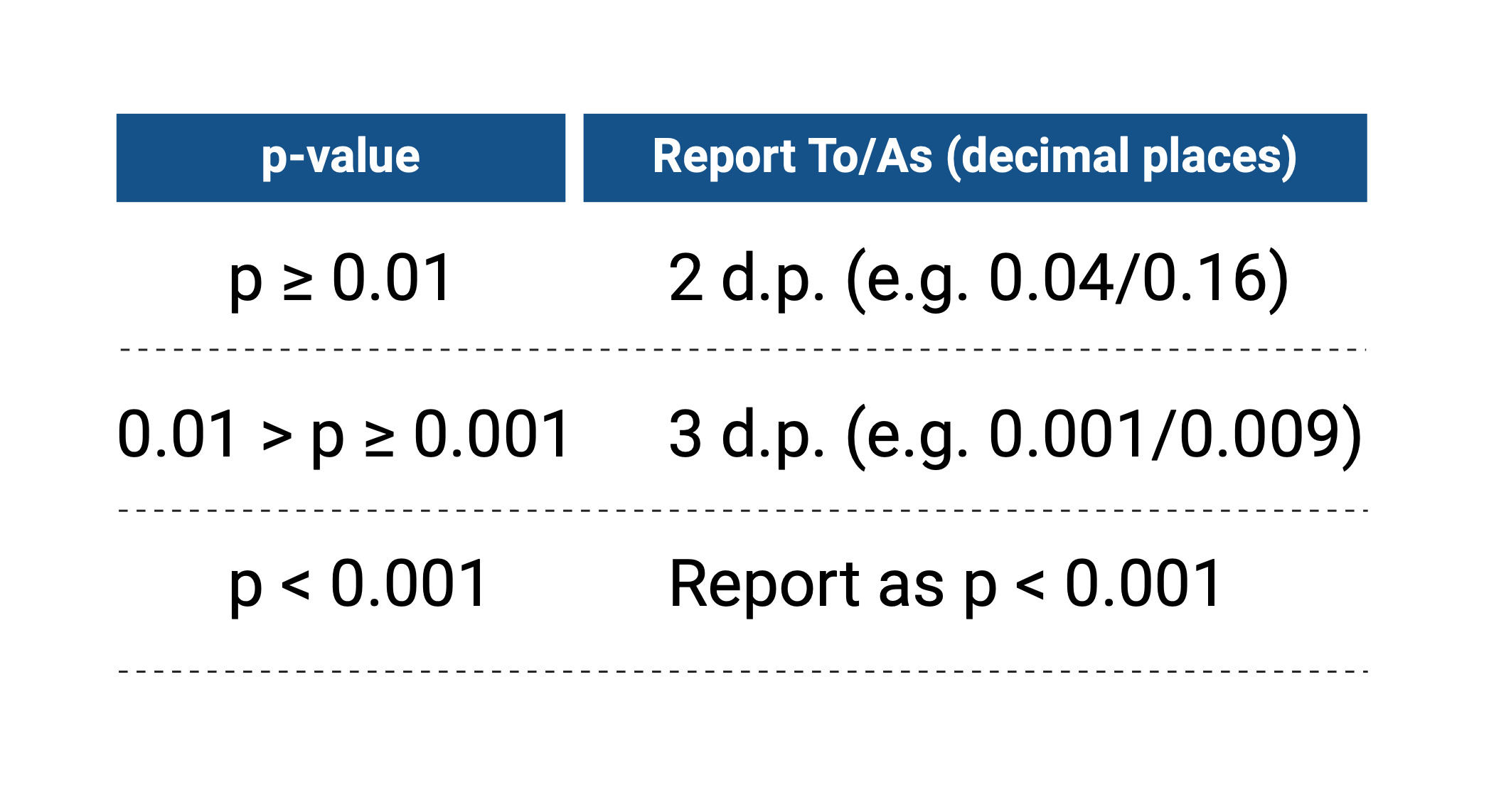 If I had a dollar for every time a research student has sent me results that contain p-values between 0.045 and 0.05 and reported that to 3 decimal places, I’d be a little less poor than I am now. Seriously, there is no need to do this. Please adhere to the following reporting guide and don’t try to put lipstick on a pig by suggesting that your p-value of 0.049 is any different to 0.05.
