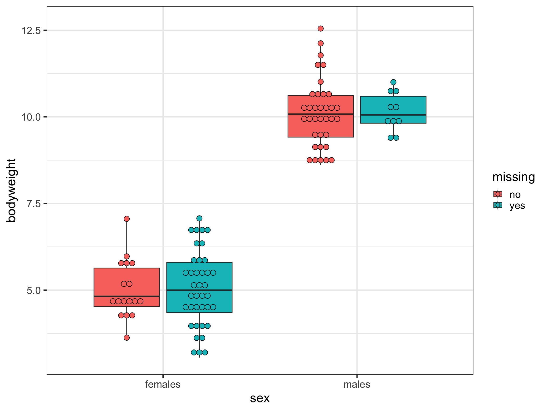# Boxplots of distributions by sexggplot(dat, aes(x = sex, y = bodyweight, fill = missing)) +geom_boxplot() +geom_dotplot(binaxis ='y', stackdir ='center', dotsize =0.5, position =position_dodge(0.75)) +theme_bw(base_size =20)