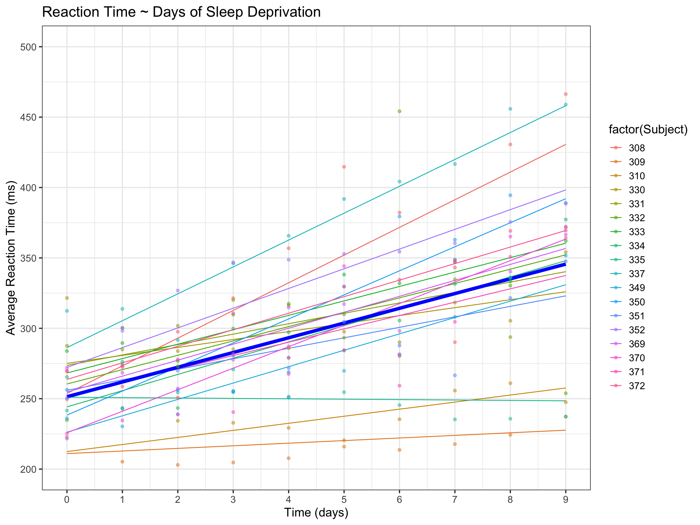 # Plot all datasleepstudy |>ggplot(aes(x = Days, y = Reaction, color =factor(Subject))) +geom_line(aes(x = Days, y = mod_pred_ran)) +geom_line(aes(x = Days, y = mod_pred_fix), linewidth =2, color ="blue") +scale_y_continuous(limits =c(200, 500), breaks =seq(200, 500, by =50)) +scale_x_continuous(limits =c(0, 9), breaks =seq(0, 9, by =1)) +geom_point(alpha =0.5) +labs(title ="Reaction Time ~ Days of Sleep Deprivation") +xlab("Time (days)") +ylab("Average Reaction Time (ms)") +theme_bw(base_size =15)