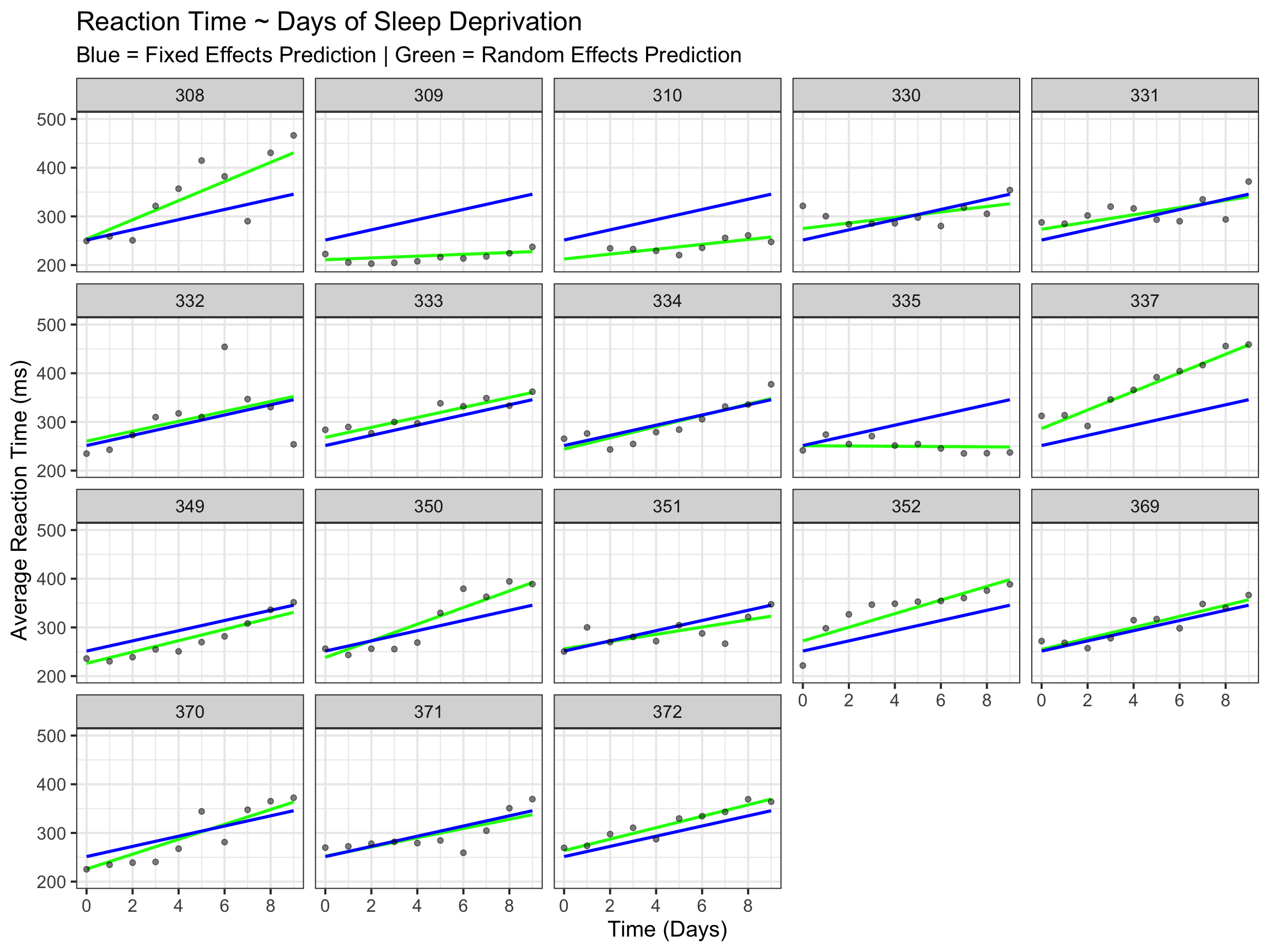 # Plot - facet on individualsleepstudy |>ggplot(aes(x = Days, y = Reaction)) +geom_line(aes(x = Days, y = mod_pred_ran), linewidth =1, color ="green") +geom_line(aes(x = Days, y = mod_pred_fix), linewidth =1, color ="blue") +scale_y_continuous(limits =c(200, 500), breaks =seq(200, 500, by =100)) +scale_x_continuous(limits =c(0, 9), breaks =seq(0, 9, by =2)) +geom_point(alpha =0.5) +facet_wrap(~Subject) +labs(x ="Time (Days)",y ="Average Reaction Time (ms)",title ="Reaction Time ~ Days of Sleep Deprivation",subtitle ="Blue = Fixed Effects Prediction | Green = Random Effects Prediction") +theme_bw(base_size =15)