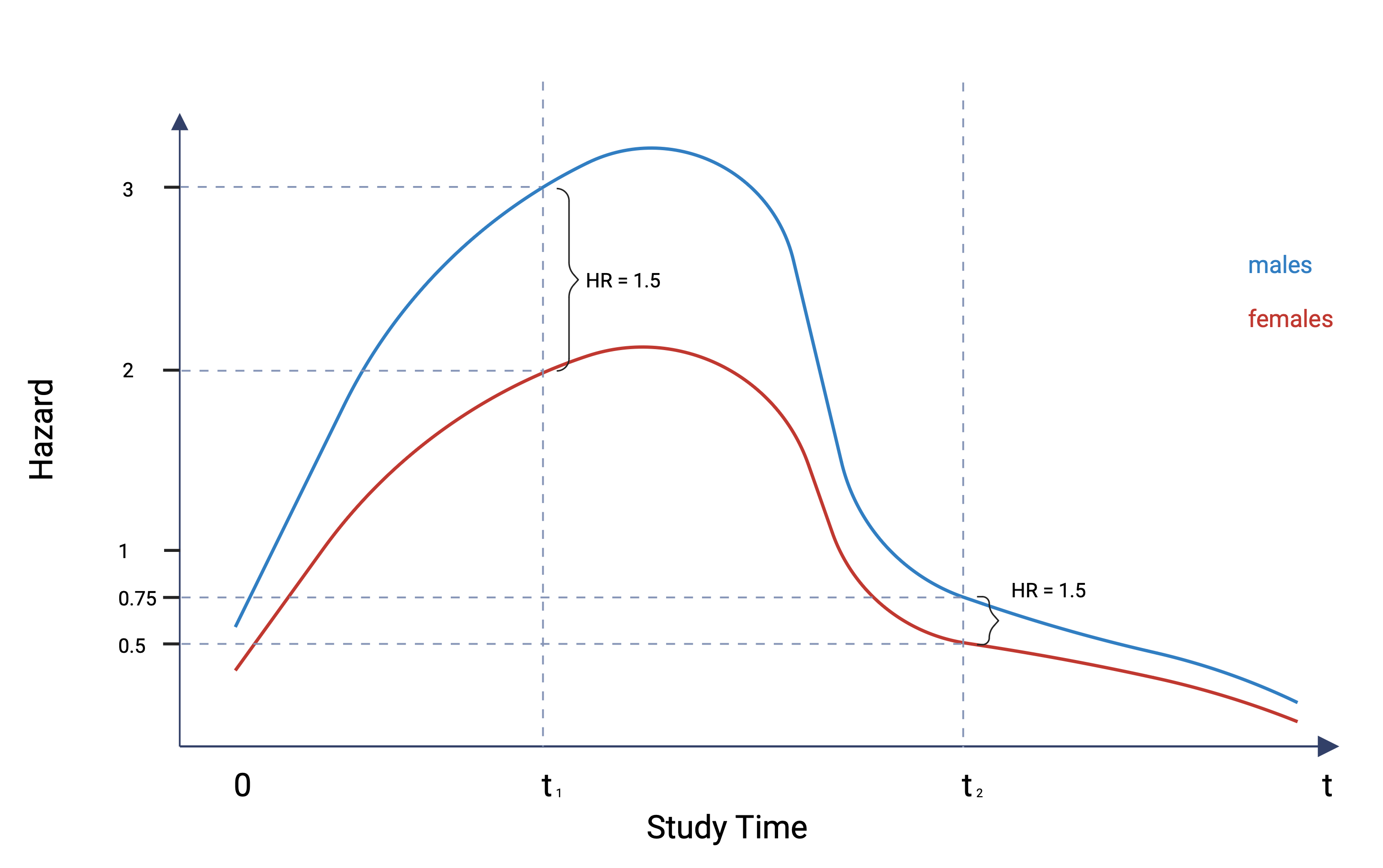 So if we look at the figure below - I have plotted hypothetical hazard functions for males (in blue) and females (in red) for the risk of some event. You’ll note that the shapes are essentially the same but are scaled versions of one another. When PH hold, then we can take a ratio of the two hazard rates at any time point and that ratio should remain constant. And I’ve illustrated that here at two time points - \(t1\) and \(t2\). The difference in the hazards obviously varies but the ratio of the hazards at those two time points is the same. At time 1 a hazard rate of 3 for males and 2 for females gives a HR of 1.5 and similarly, at time 2, a hazard rate of 0.75 for males and 0.5 for females, again gives a HR of 1.5.