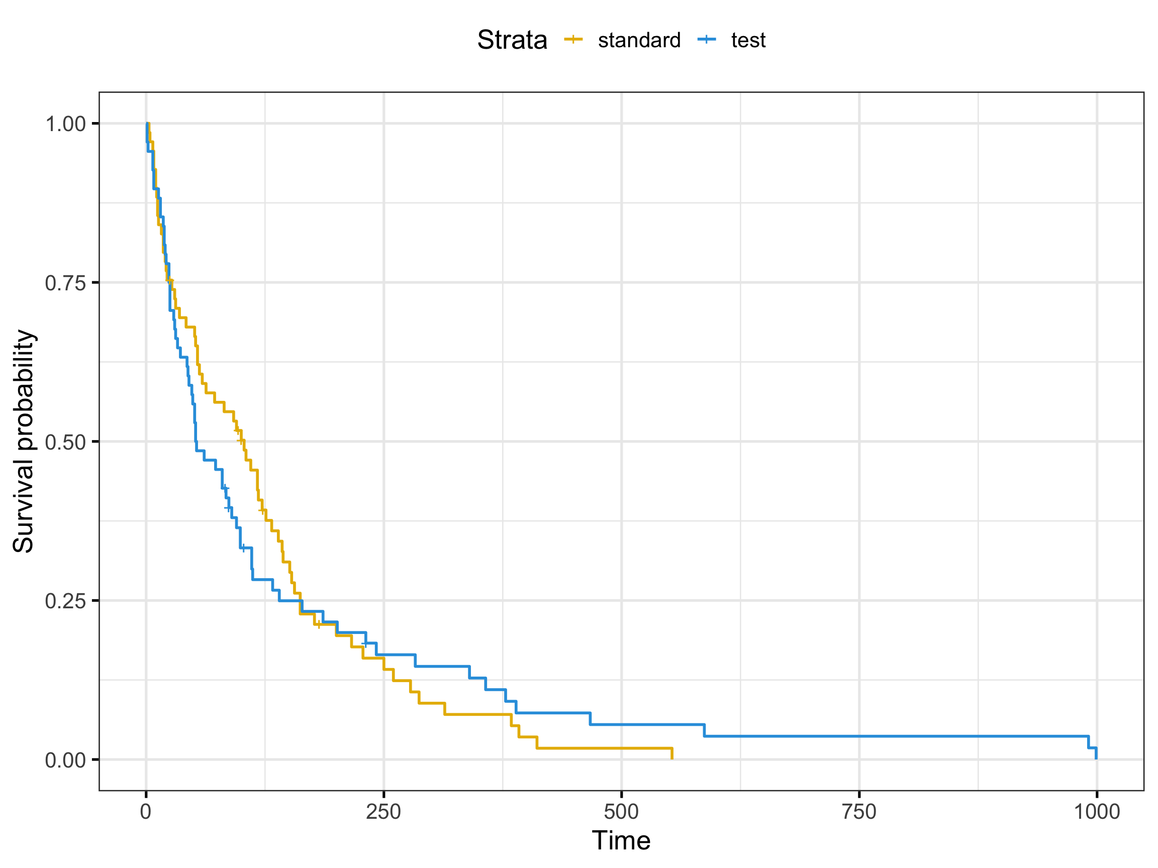 As a precursor step let’s plot the Kaplan-Meier curves for these data - for no other reason than to calibrate our expectations for the upcoming PH tests.