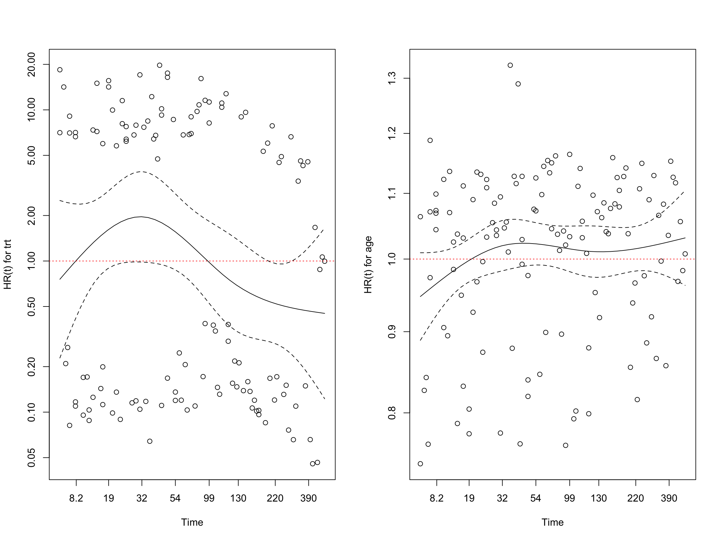 The hypothesis test for a horizontal line fitted through the residuals for each covariate reveals a non-significant p value for both trt and age, although we would have good justification for doubting the validity of a constant HR for trt. Further evidence for this is provided in the plots - while the smoother is fairly horizontal for age, it is not for trt, which demonstrates an increase in the HR early on followed by a gradual decline after the first or so.