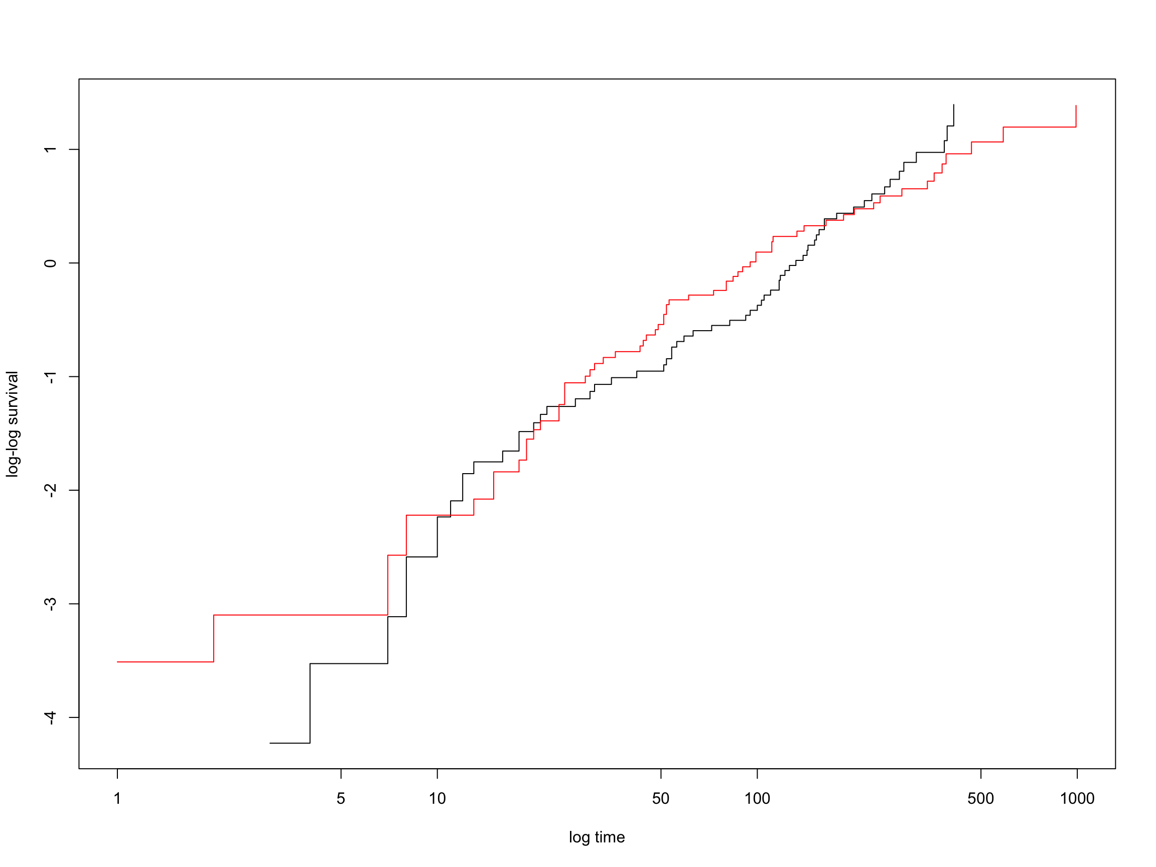 plot(survfit(Surv(vdata1$time, vdata1$status) ~ vdata1$trt), col =c("black", "red"), fun ="cloglog", xlab ="log time", ylab ="log-log survival")
